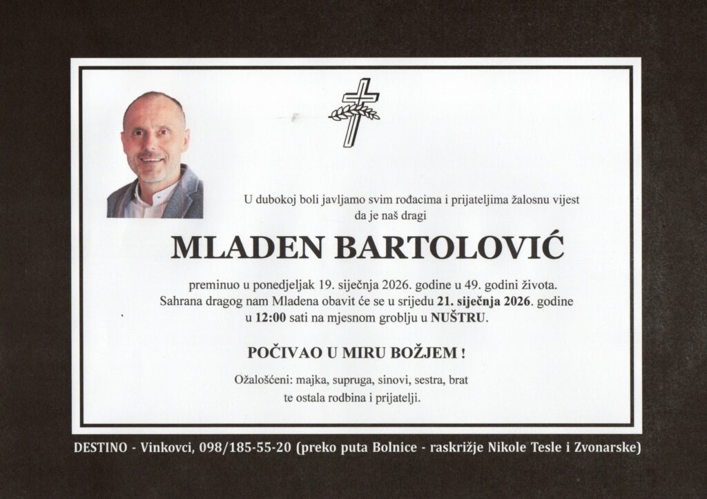 Posljednji ispraćaj Mladena Bartolovića bit će u srijedu, 21. siječnja 2026. godine.